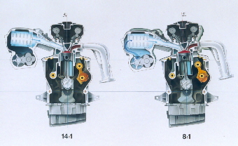 Lösung mit variablem Verdichtungsraum Die Kombination aus reduziertem Hubraum, hohem Kompressordruck und variablem Verdichtungsverhältnis
